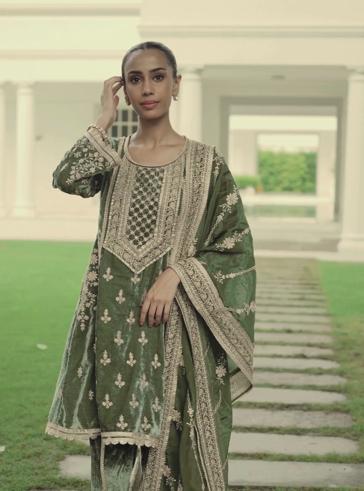 Shayari Velvet Olive Green Kurta with Dhoti Pant Set