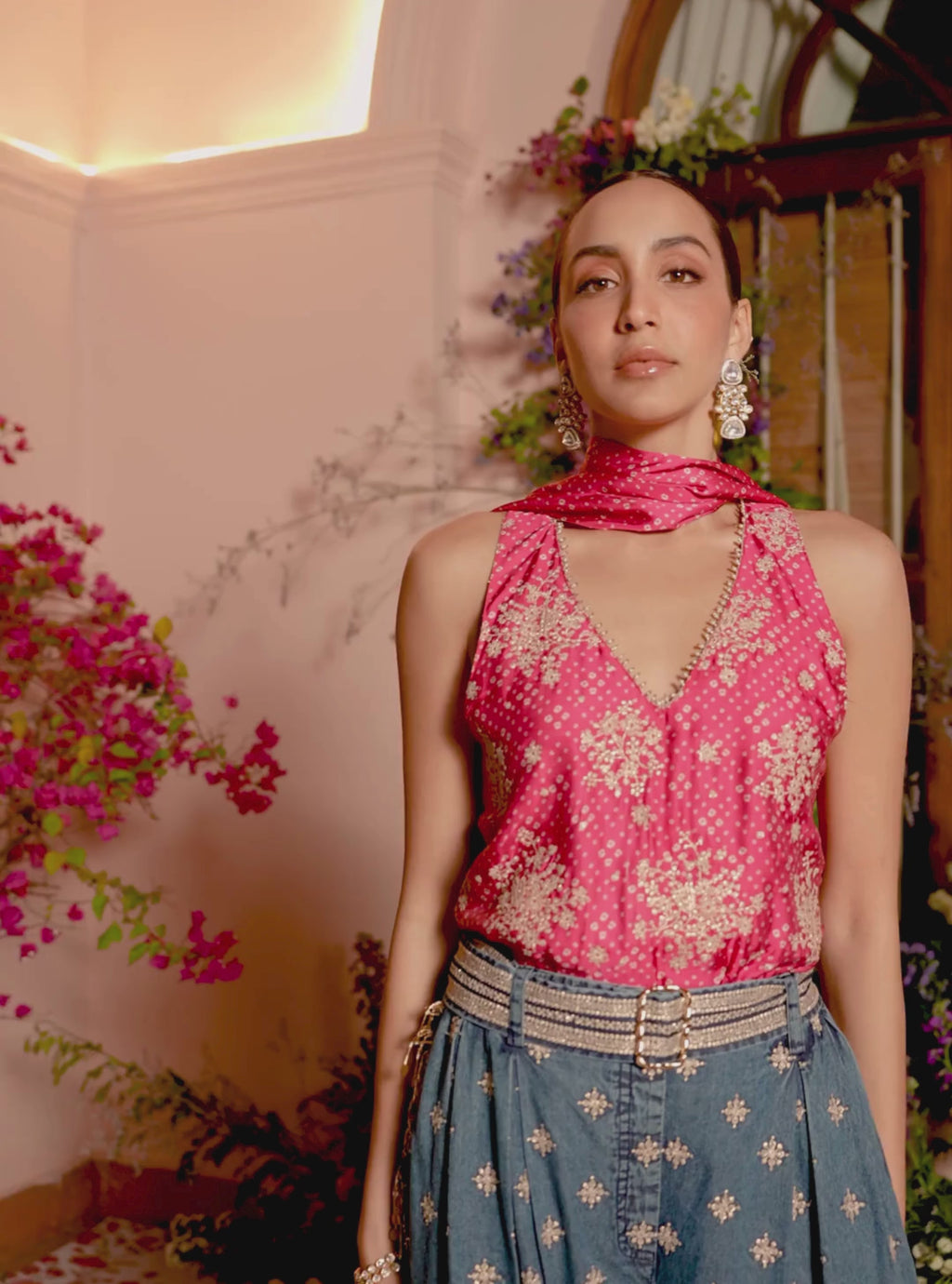 Lunira Denim Waistcoat With Cupro Satin Printed Fuschia Pant