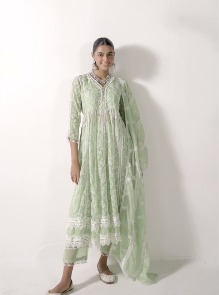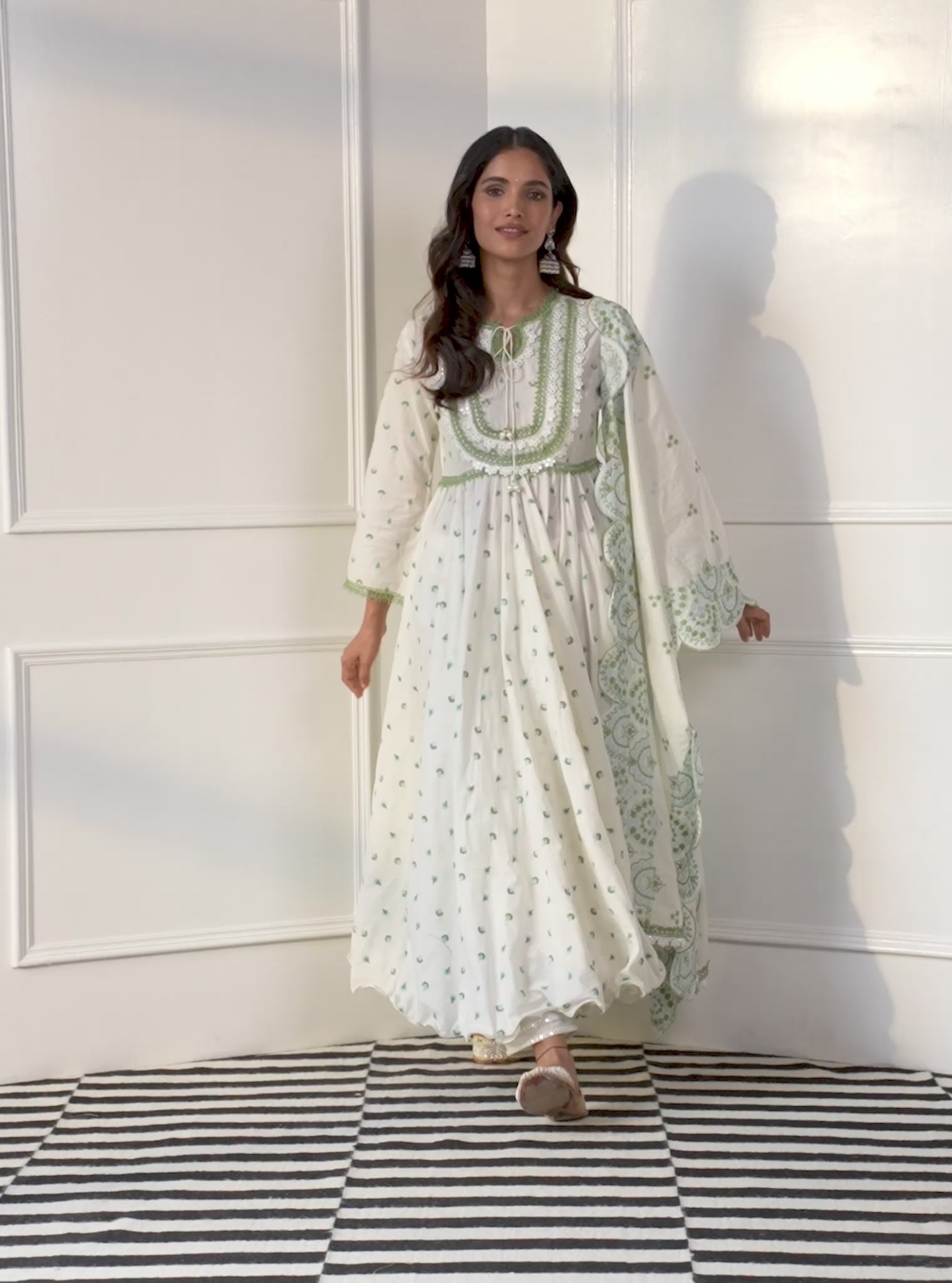 Mulmul Cotton Arris Green Anarkali  Kurta With Diagonal Pintuck White Pant