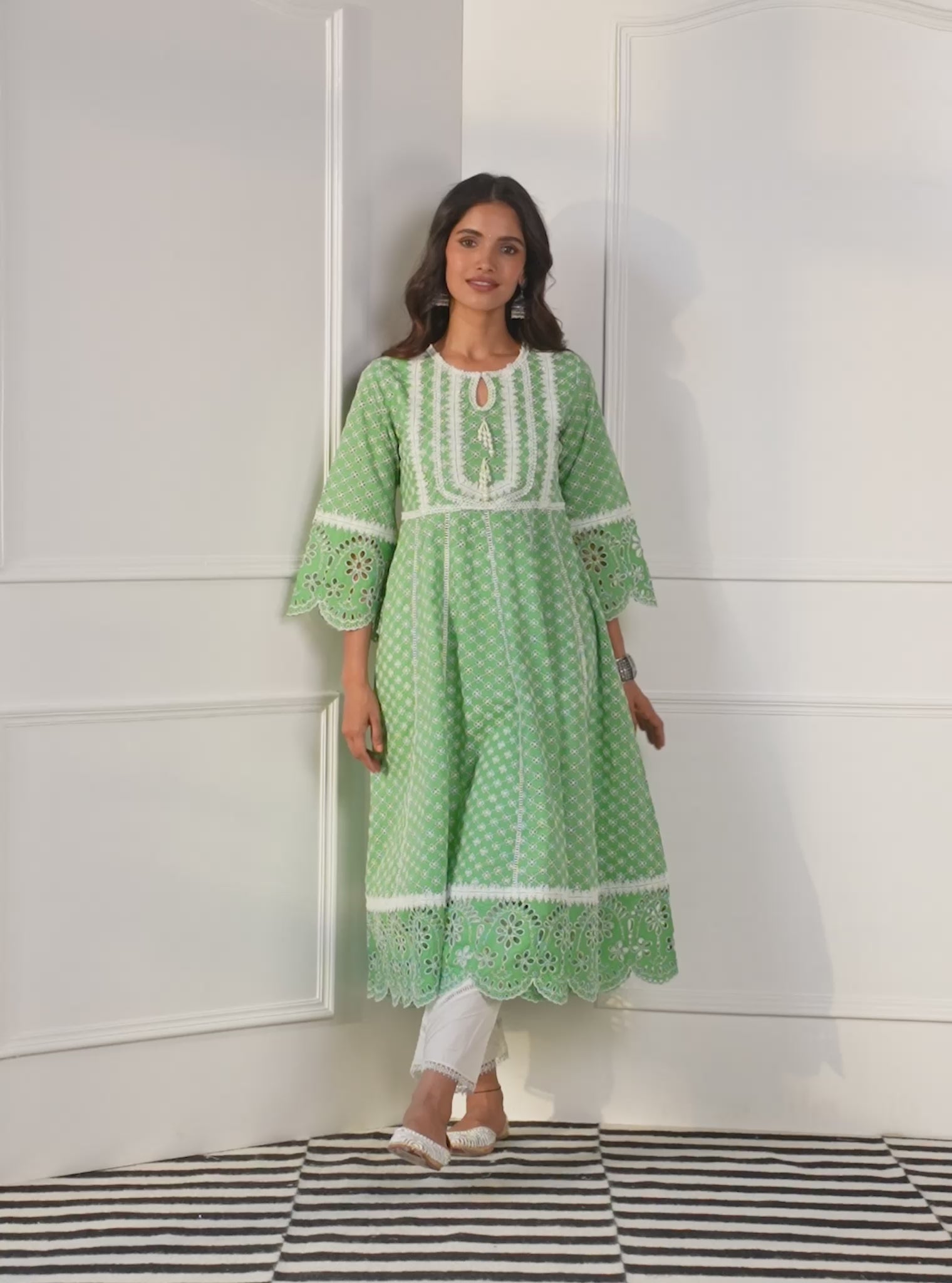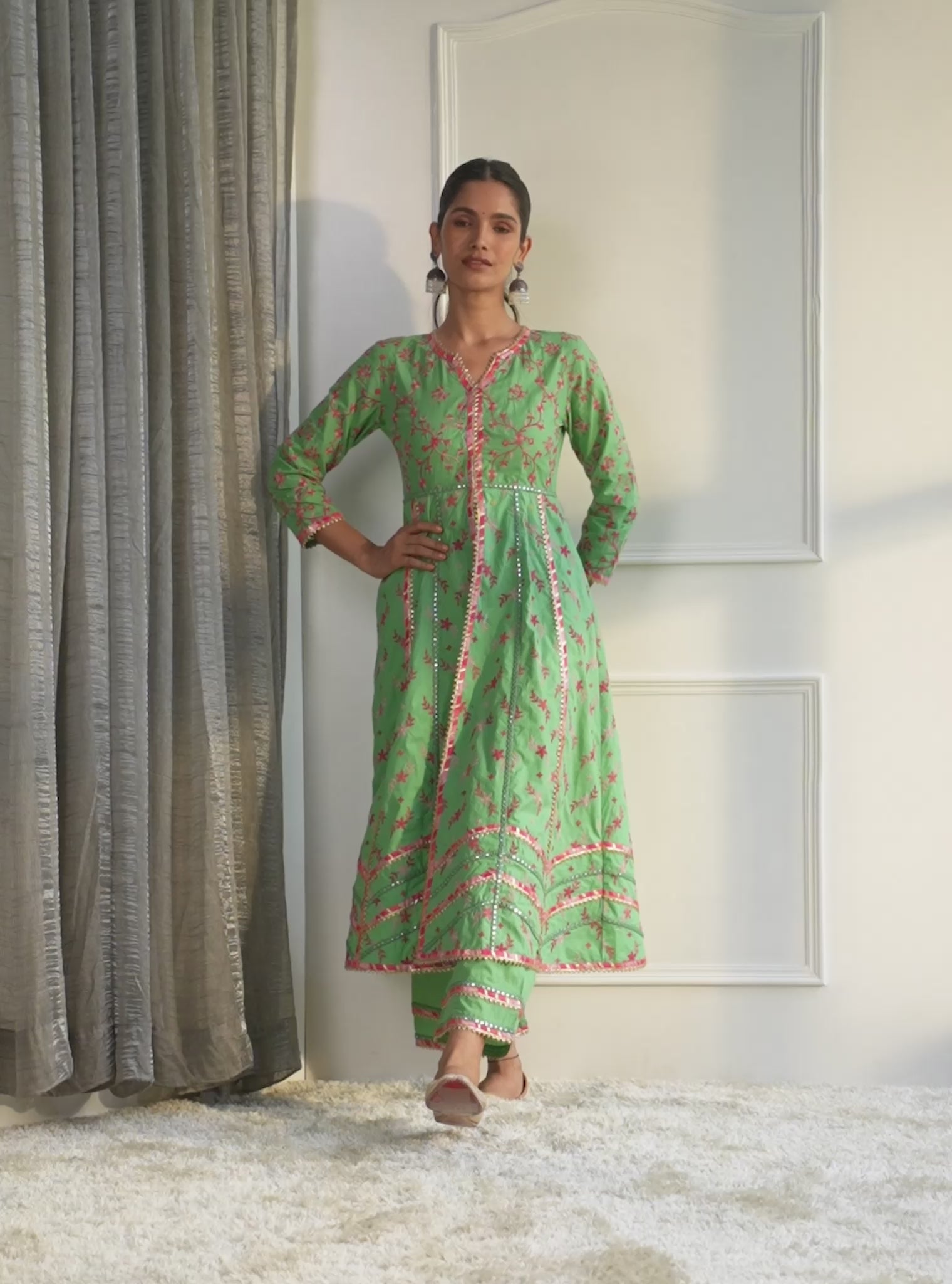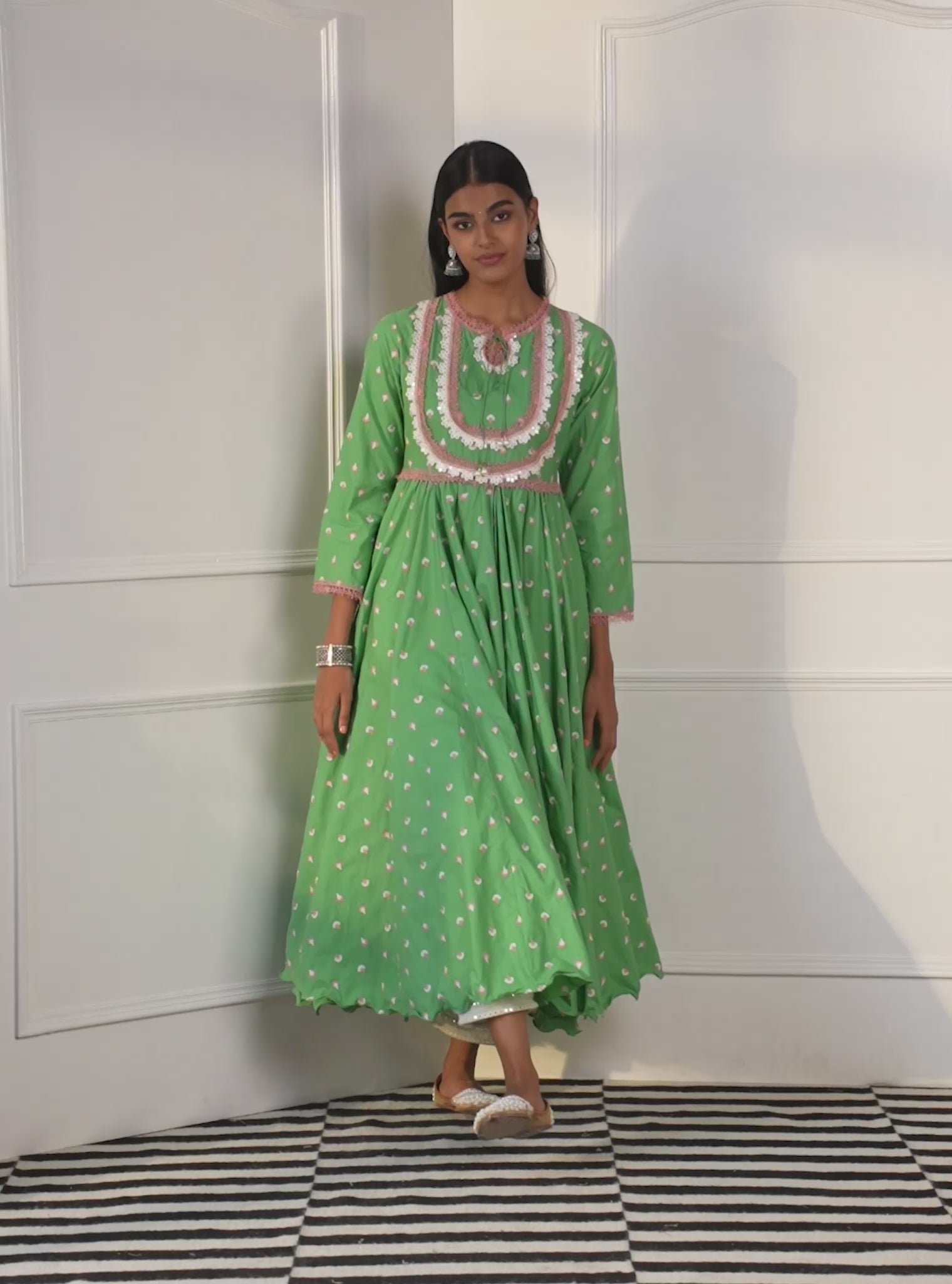 Mulmul Cotton Ayla Anarkali Green Kurta With Ayla Green Pant