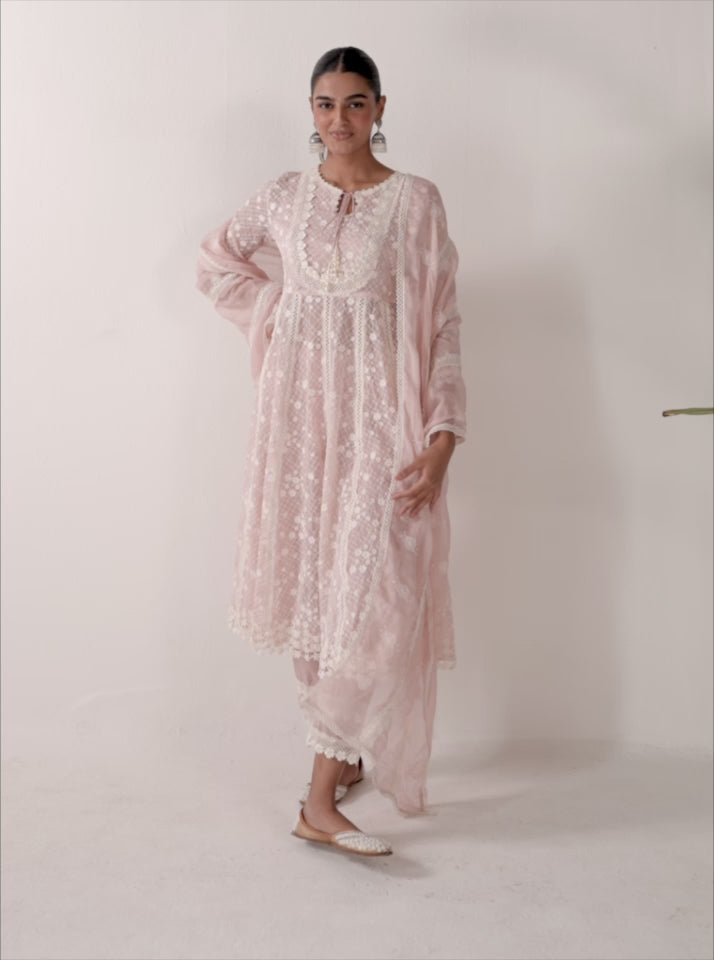 Mulmul Organza Zola Anarkali Pink Kurta With Mulmul Cotton Zola Pink Pant