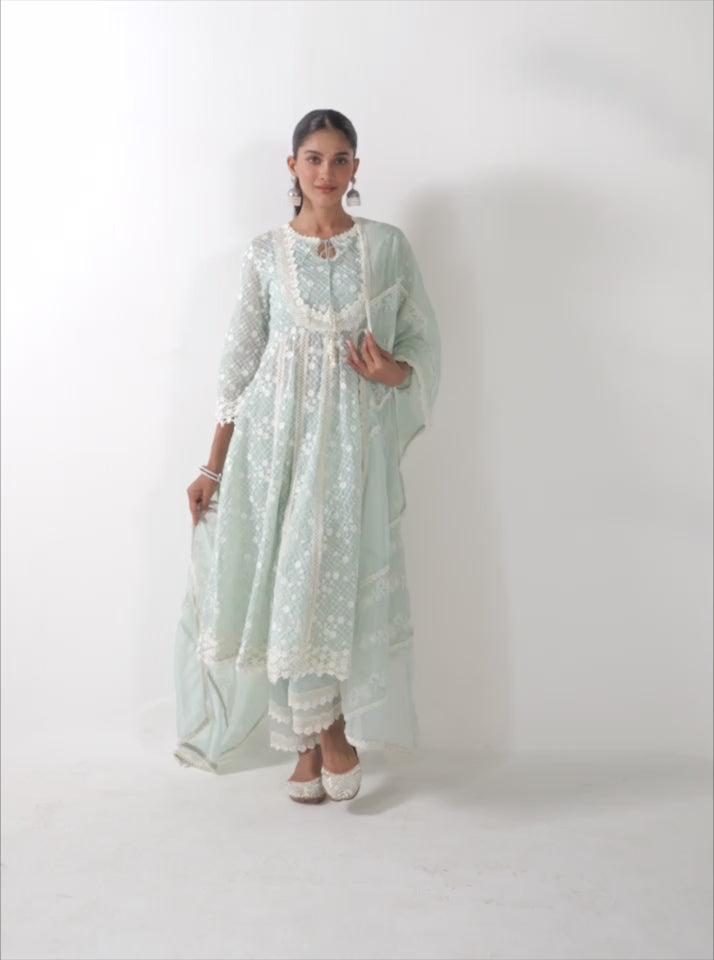 Mulmul Organza Zola Anarkali Light Blue Kurta With Mulmul Cotton Zola Light Blue Pant