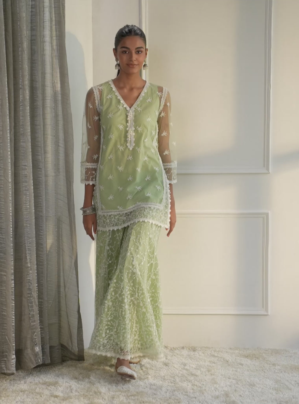 Mulmul Net Odyssey Green Kurta With Odyssey Green Sharara
