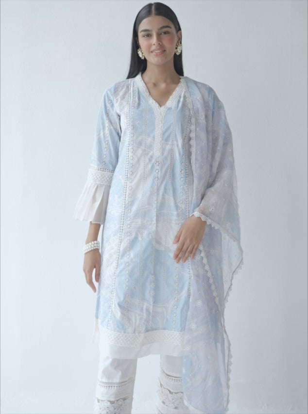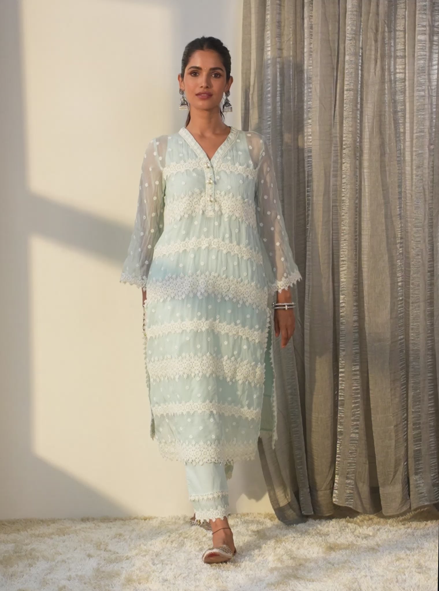 Mulmul Organza Nessa Light Blue Kurta With Mulmul Cotton Nessa Light Blue Pant