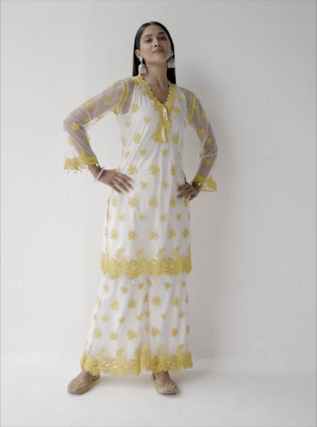 Mulmul Net Glenn White Kurta With Glenn White Pallazo