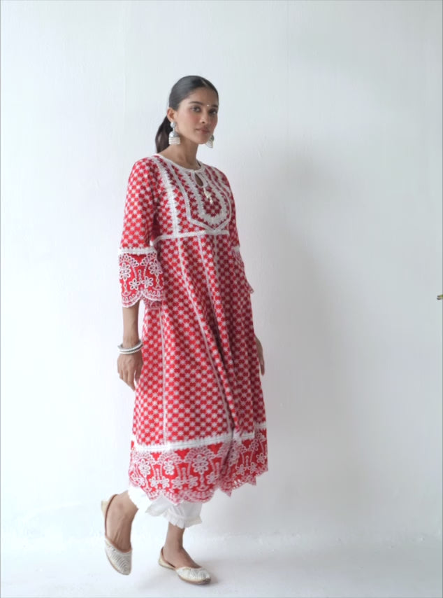 Mulmul Cotton Arris Red Anarkali  Kurta With Diagonal Lace White Pant
