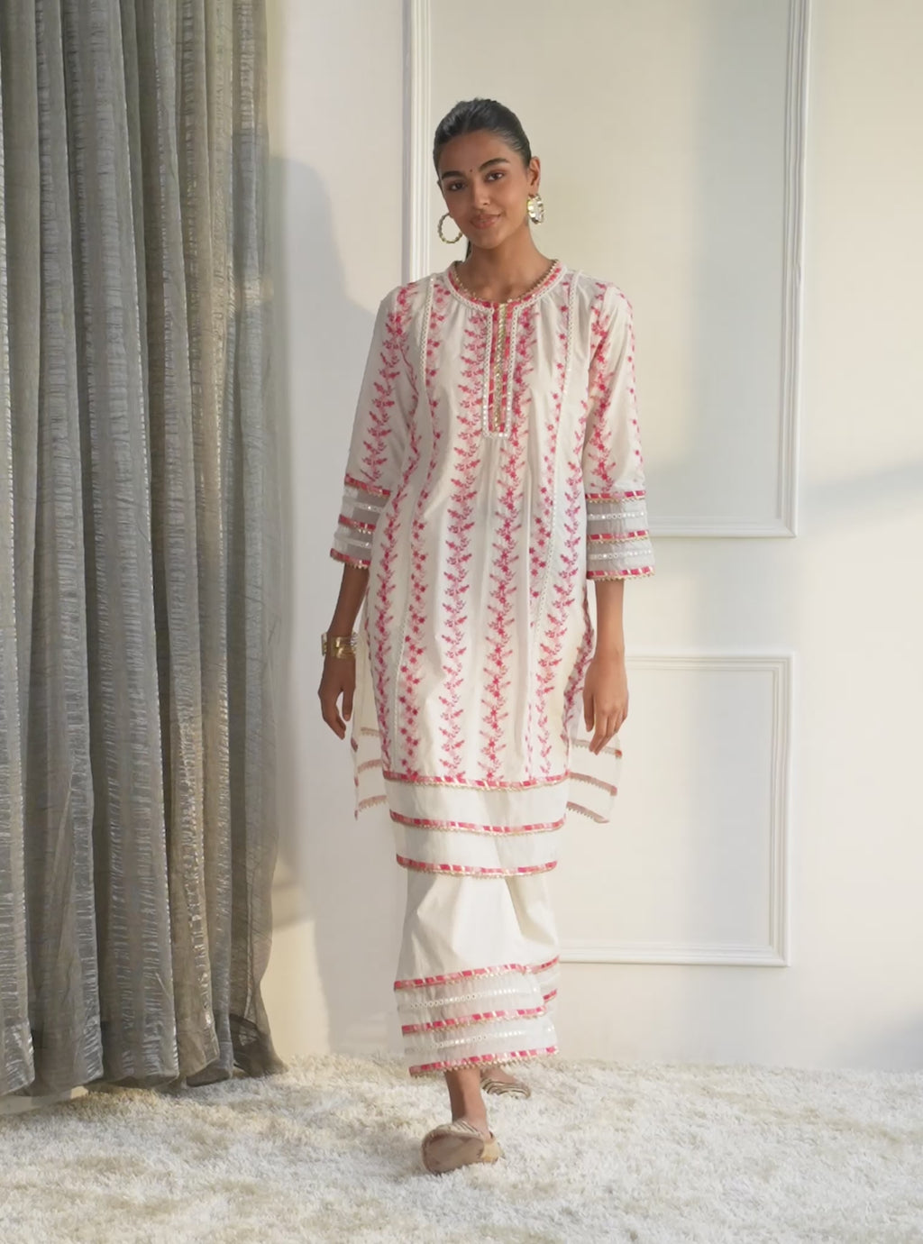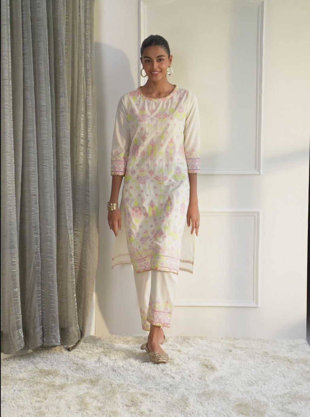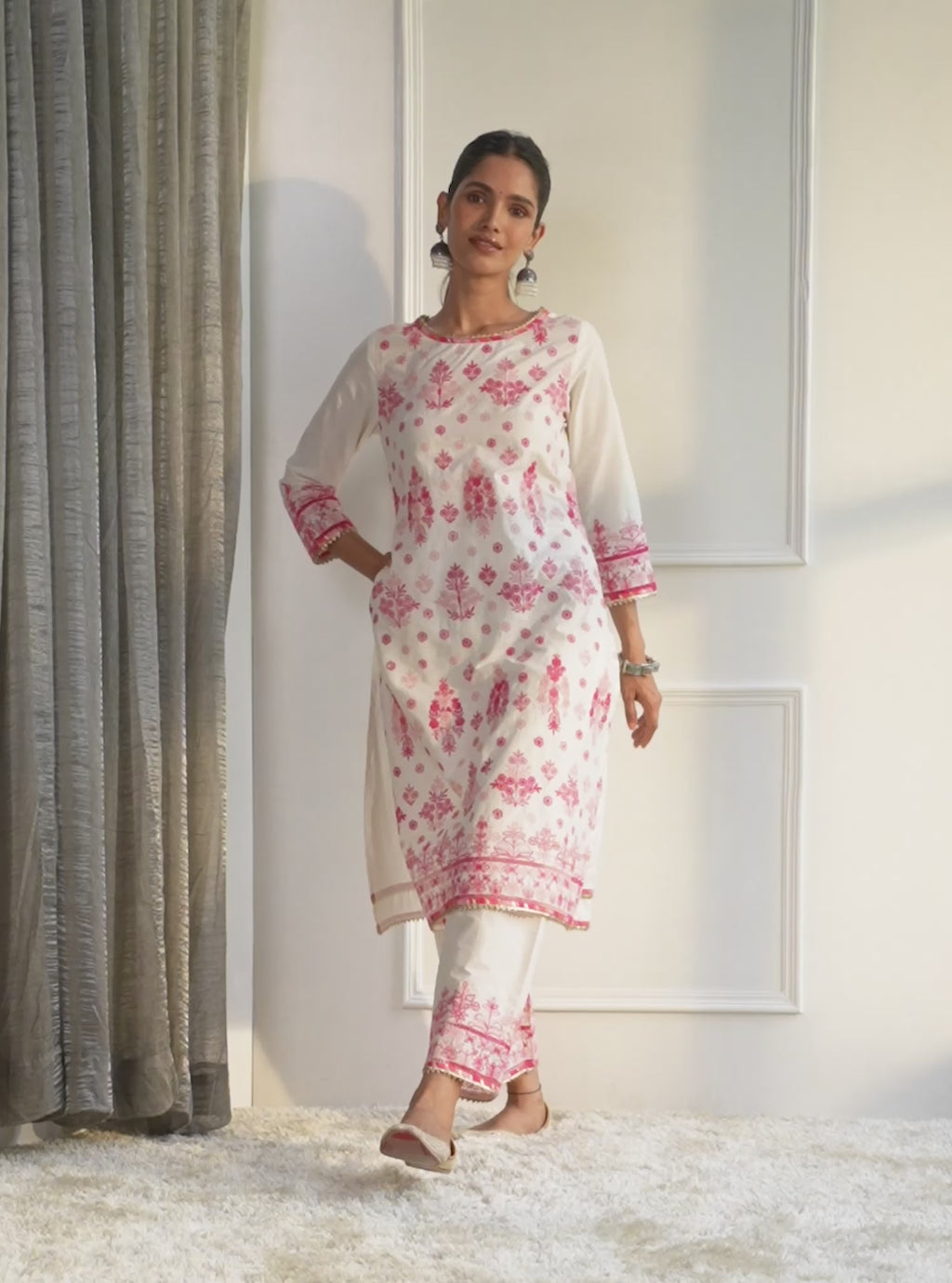 Mulmul Cotton Zahava Off White/Pink Kurta With Zahava Off White/Pink Pant