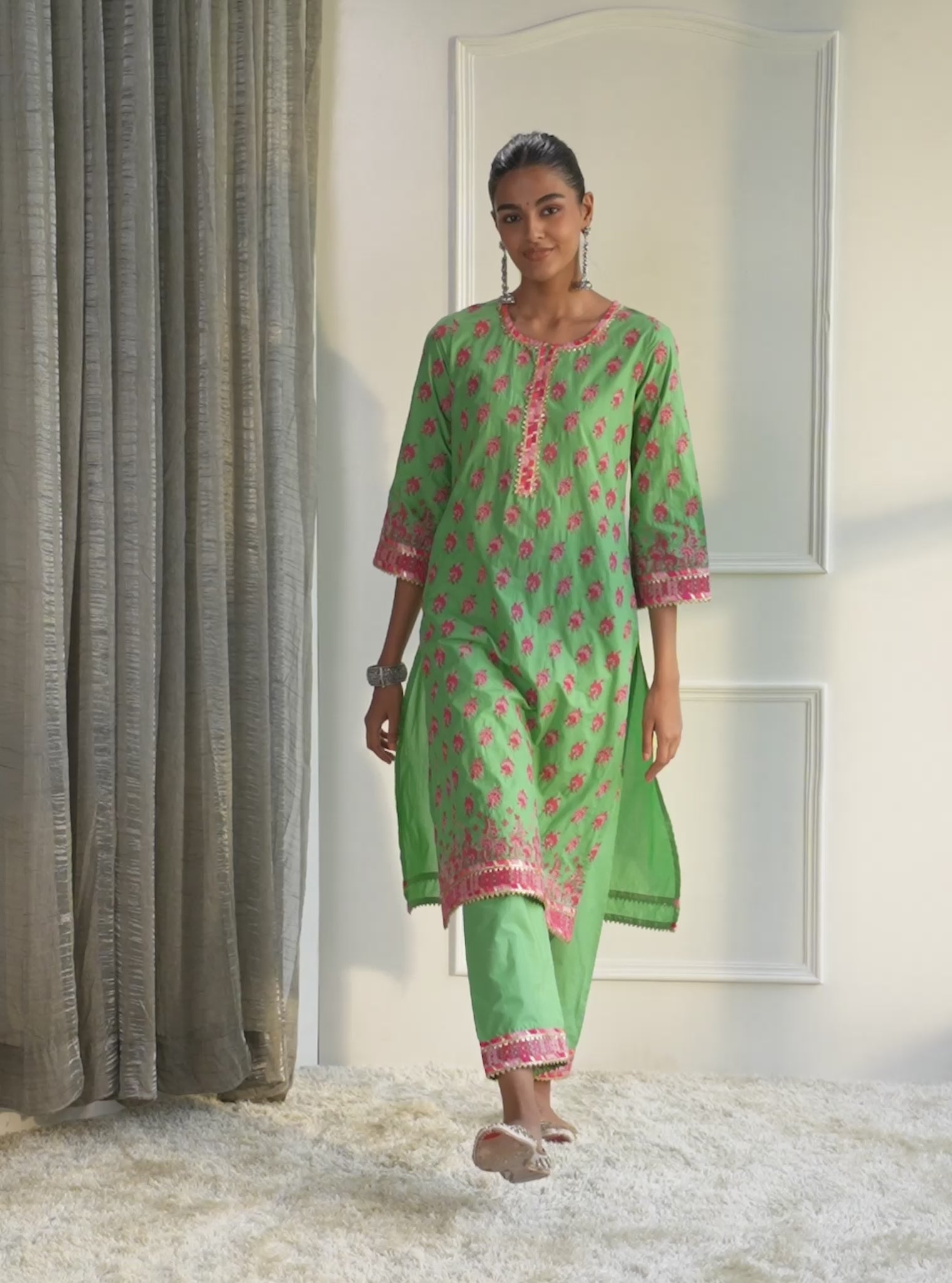 Mulmul Cotton Denise Green Kurta With Denise Green Pant