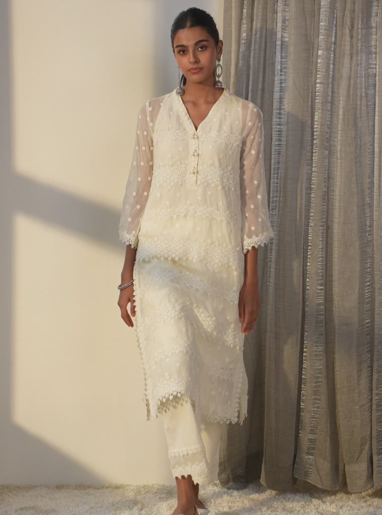 Mulmul Organza Nessa Off White Kurta With Mulmul Cotton Nessa Off White Pant