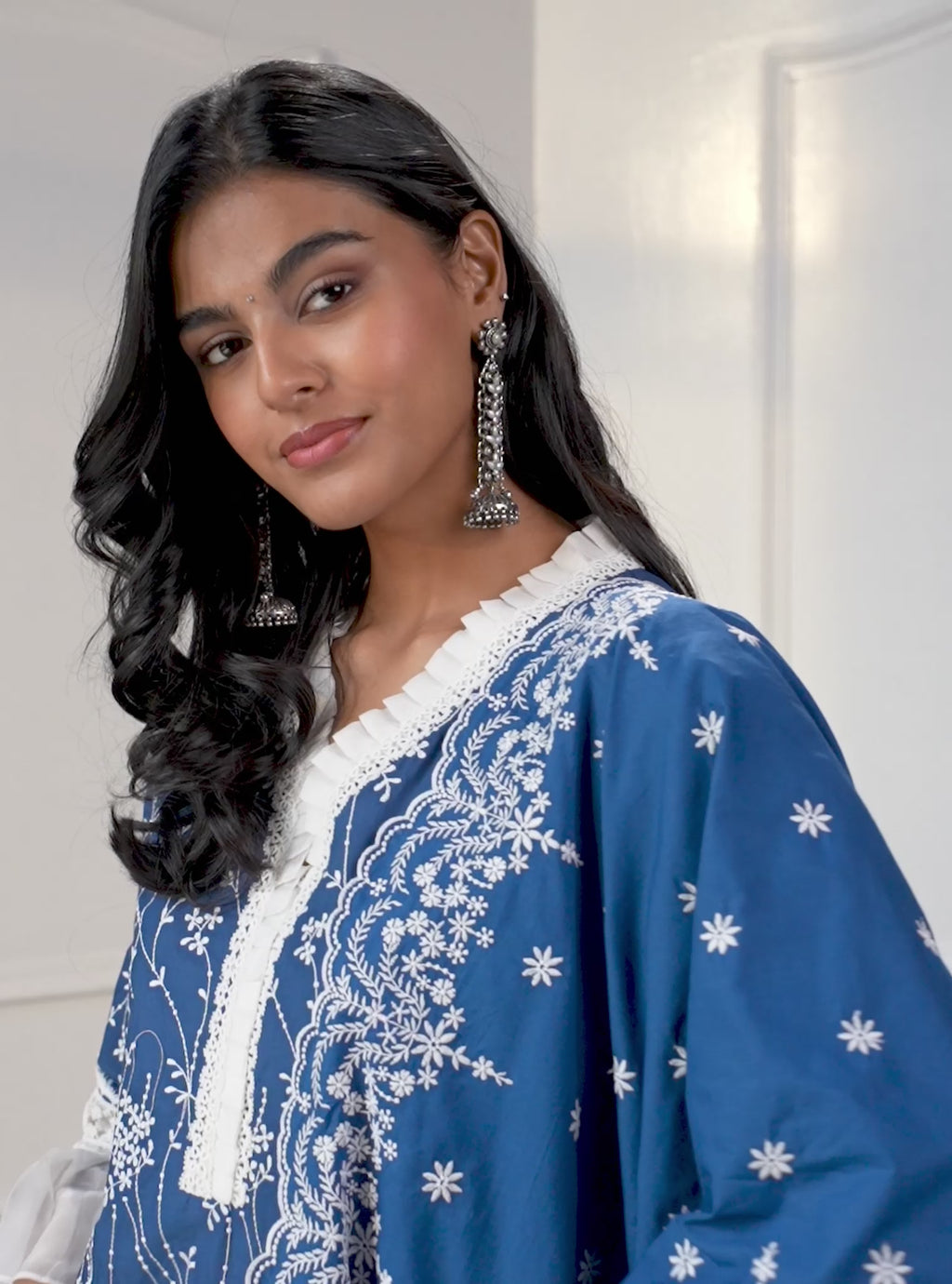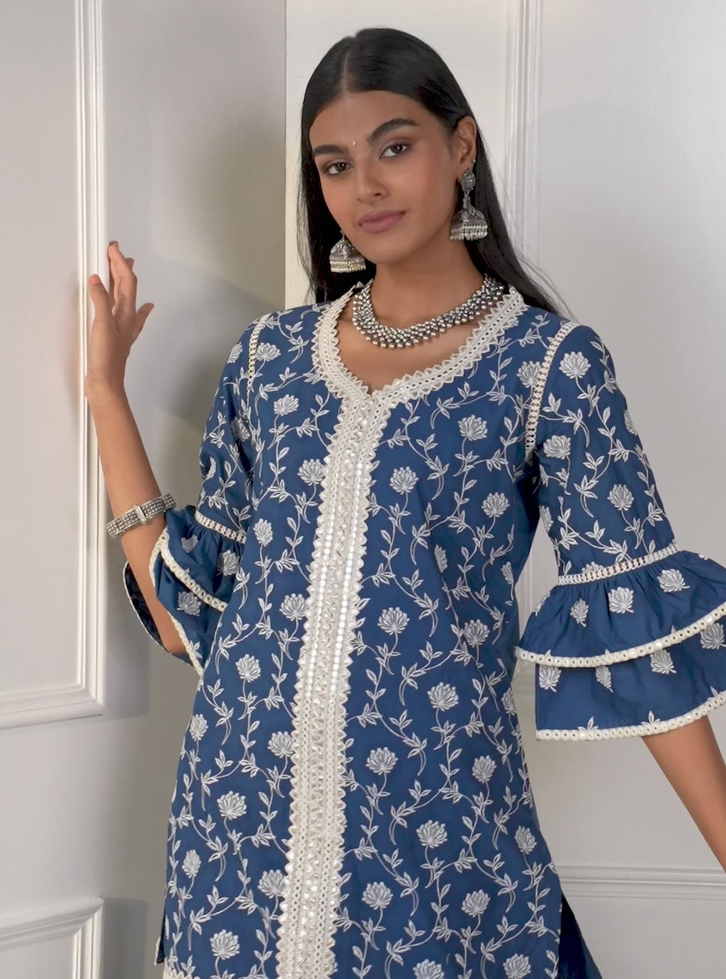 Mulmul Cotton Pixie Navy Kurta With Emb Bellbottom Pyajama