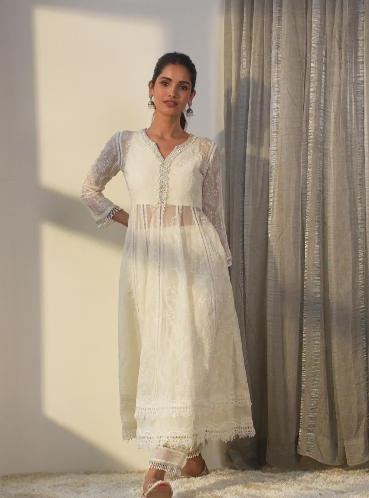 Mulmul Organza Valerie Anarkali Off White Kurta With Supima Cotton Valerie Off White Pant