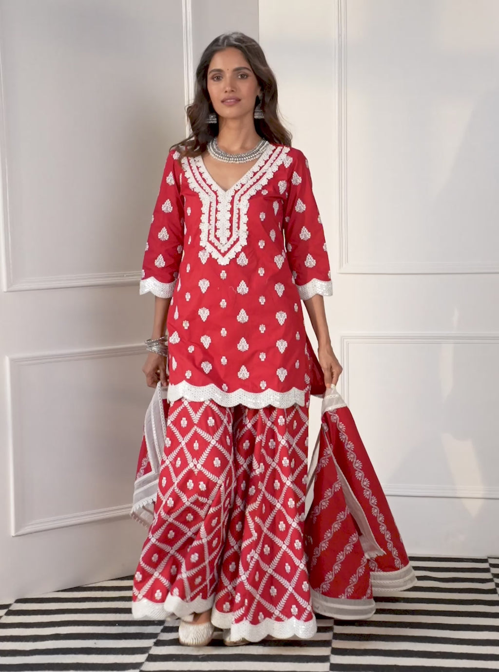 Mulmul Cotton Zoriana Red Kurta With Zoriana Red Sharara