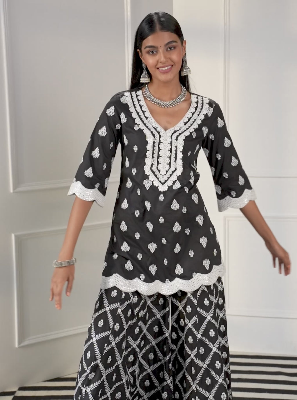 Mulmul Cotton Zoriana Black Kurta With Zoriana Black Sharara