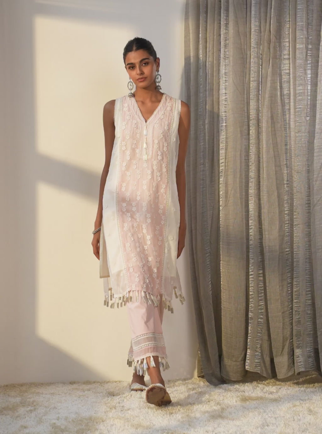 Mulmul Cotton Patricia Pink Kurta with Mulmul Cotton Mirror Gota White Pant