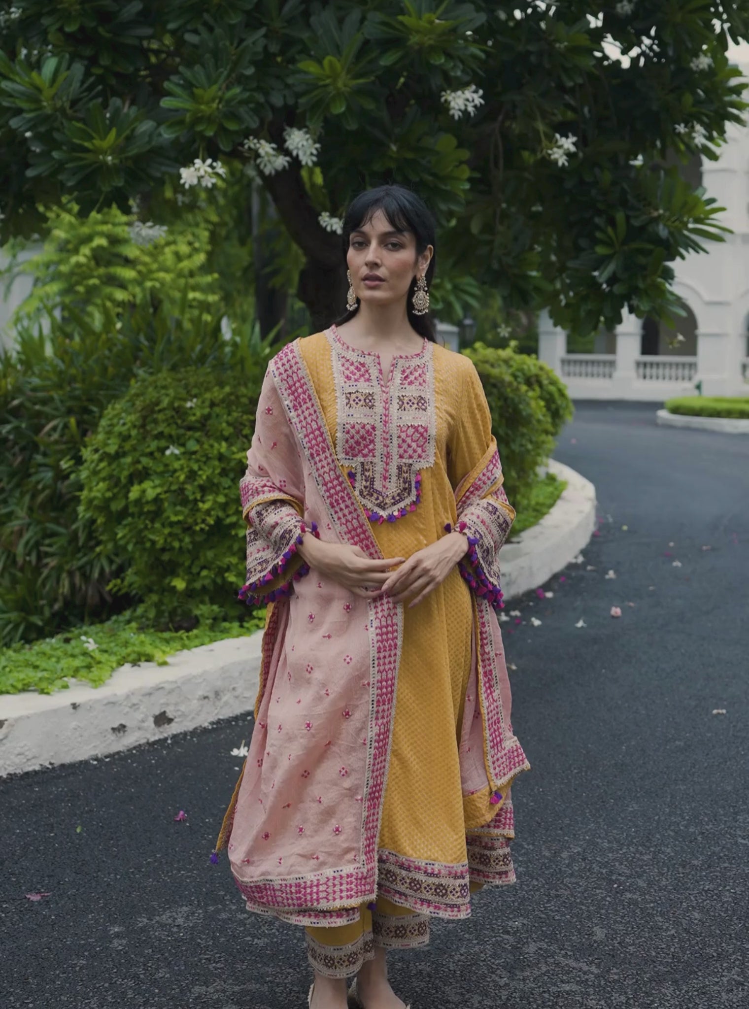Mangal Banarsi Yellow Kurta With Pink Pant