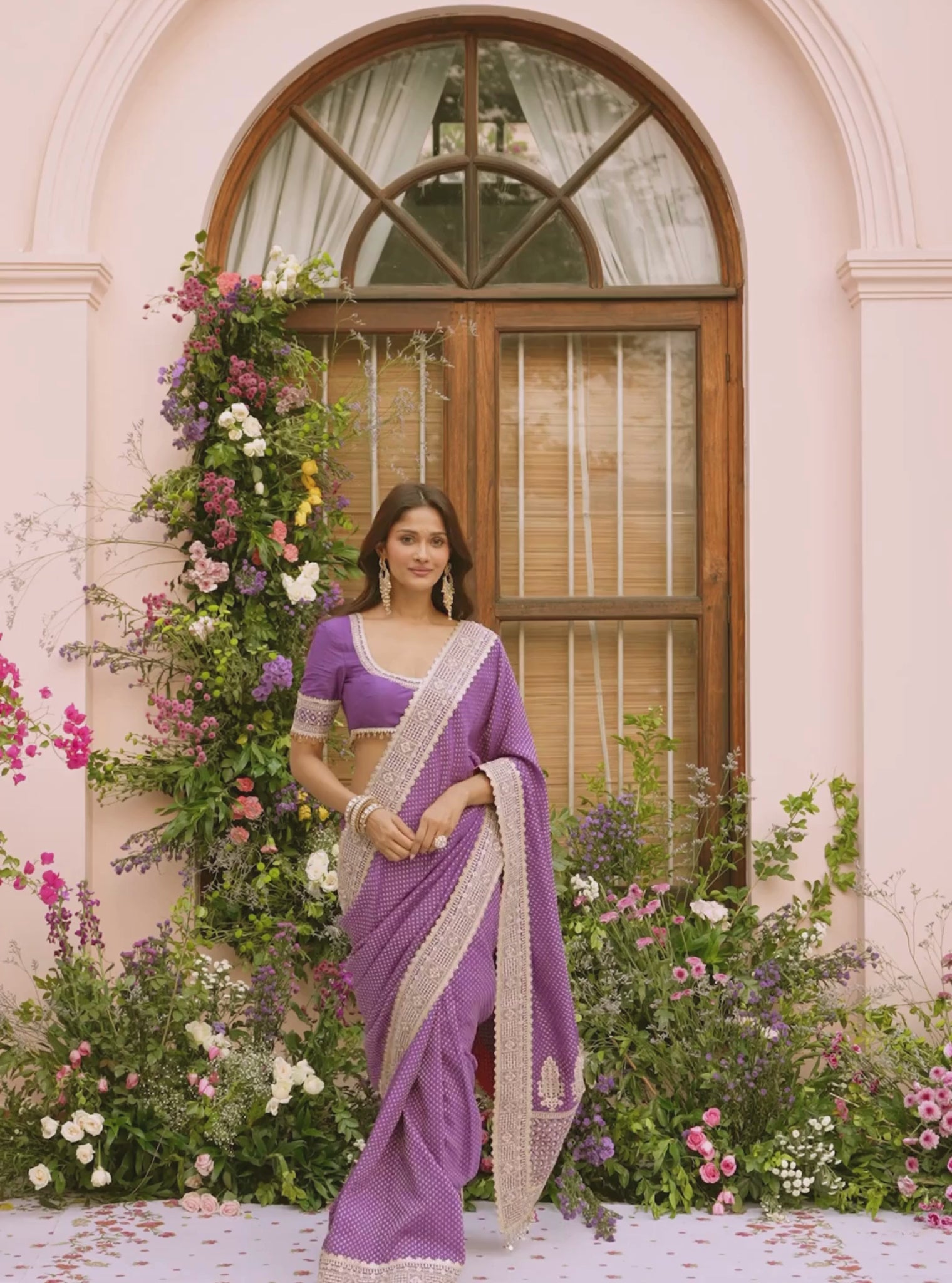 A classic festive saree crafted in Banarasi fabric with delicate polka dot detailing that adds depth without overpowering the look. This Red saree drapes fluidly while holding its structure, making it ideal for long celebrations. Finished with an intricately detailed border that lends richness in a restrained way. Paired with a smooth Pima Satin blouse for comfort and contrast.