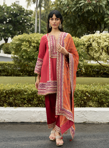 A celebration of heritage charm and vibrant contrast, this kurta set is designed for the modern festive wardrobe. The short, straight kurta in Banarsi coloured polka dot fabric carries a timeless appeal, its woven patterns reflecting artisanal finesse. Paired with tailored pima satin pants, the look is brought to life by an off-white lurex-insert dupatta in a warm mustard hue, finished with a subtle sheen that catches the light. The harmonious blend of texture and color makes this ensemble a versatile choice for pre-wedding festivities, cultural gatherings, and intimate celebrations where tradition meets contemporary style.
