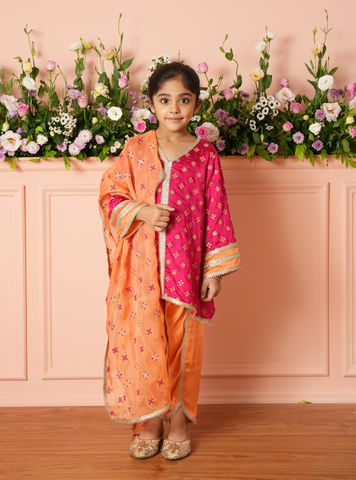 Crafted for cheerful celebrations, this vibrant kurta set brings together comfort and charm. The mustard Bemberg satin kurta features an overlapping front, adorned with gold buti embroidery and delicate gota lace along the neckline, cuffs, and hem. It is paired with pink Bemberg satin dhoti pants that add a playful touch to the silhouette. Complete the look with the optional pink organza Tazmin dupatta for an extra hint of festive flair.