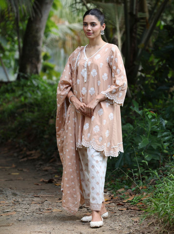 Timeless elegance meets modern comfort in this navy blue kurta set, perfect for summer soirées and festive gatherings. The deep, rich hue is beautifully adorned with delicate white thread embroidery. Designed with a flattering V-neckline and finished with lace detailing, the kurta features scalloped hemline and sleeves. Paired with contrasting white straight pants featuring coordinated motifs, this set strikes the perfect balance between contrast and cohesion. The ensemble is completed with an embroidered dupatta with lace accents.