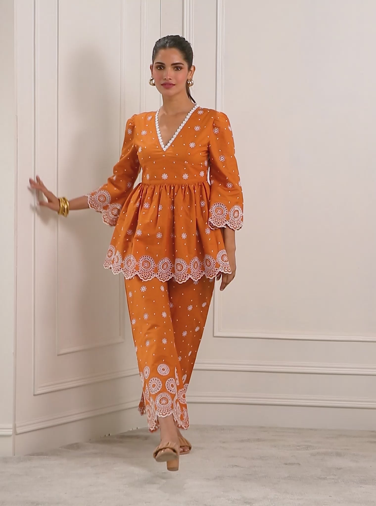 Aurelia In Rust Is A Coordinated Set Featuring Bold Circular Embroidery Motifs Along The Scalloped Hems And Smaller Flower Motifs Spaced Out Perfectly To Bring A Balance. The Set Includes A Peplum Top With A Flattering V-Neckline Embellished With Cotton Lace And Flared Sleeves With A Subtle Puff On The Shoulder, And Straight-Fit Pants Made For Comfort.