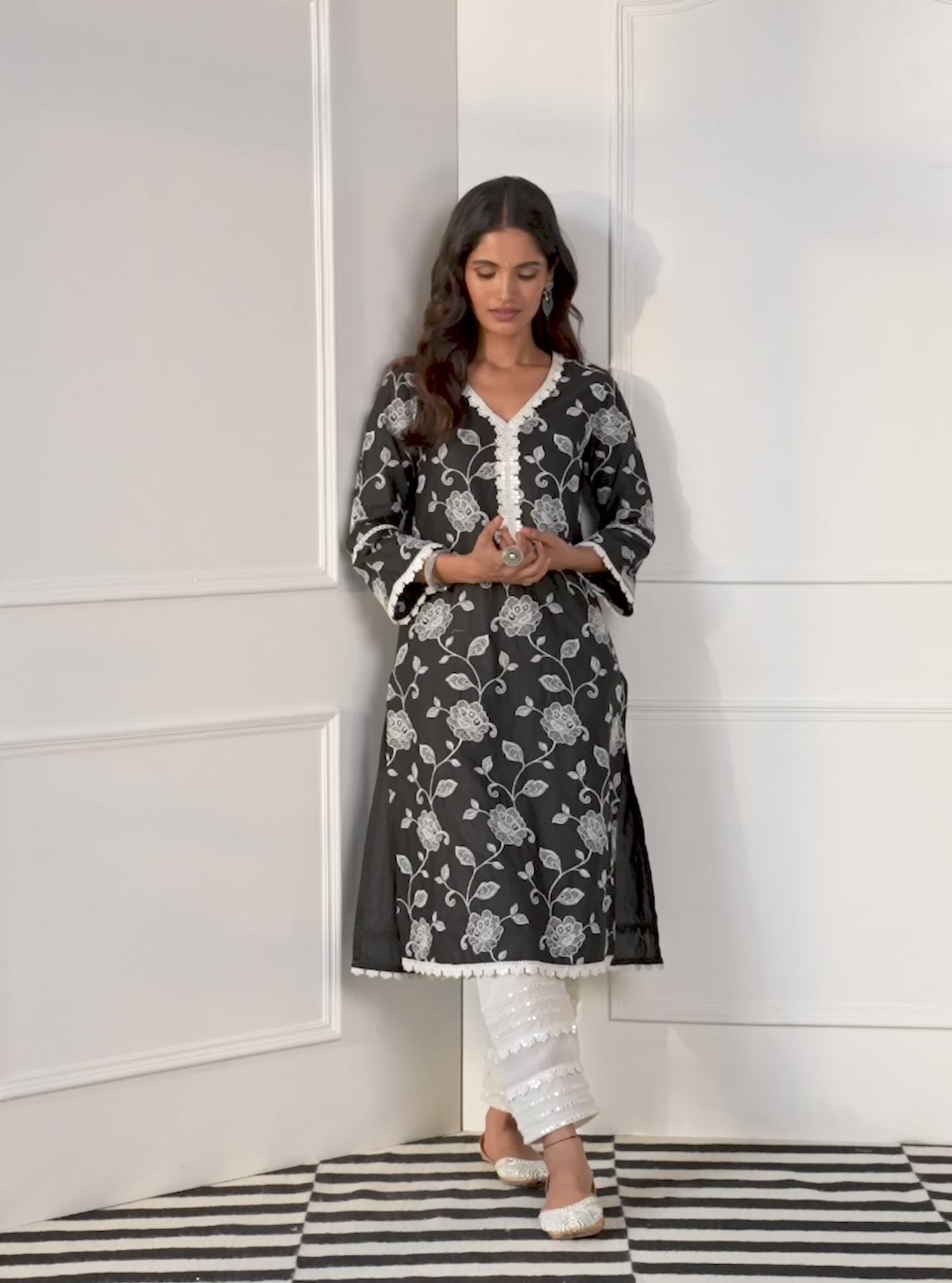 Mulmul Cotton Ezra Black Kurta With Mulmul Cotton Mirror Gota White Pant