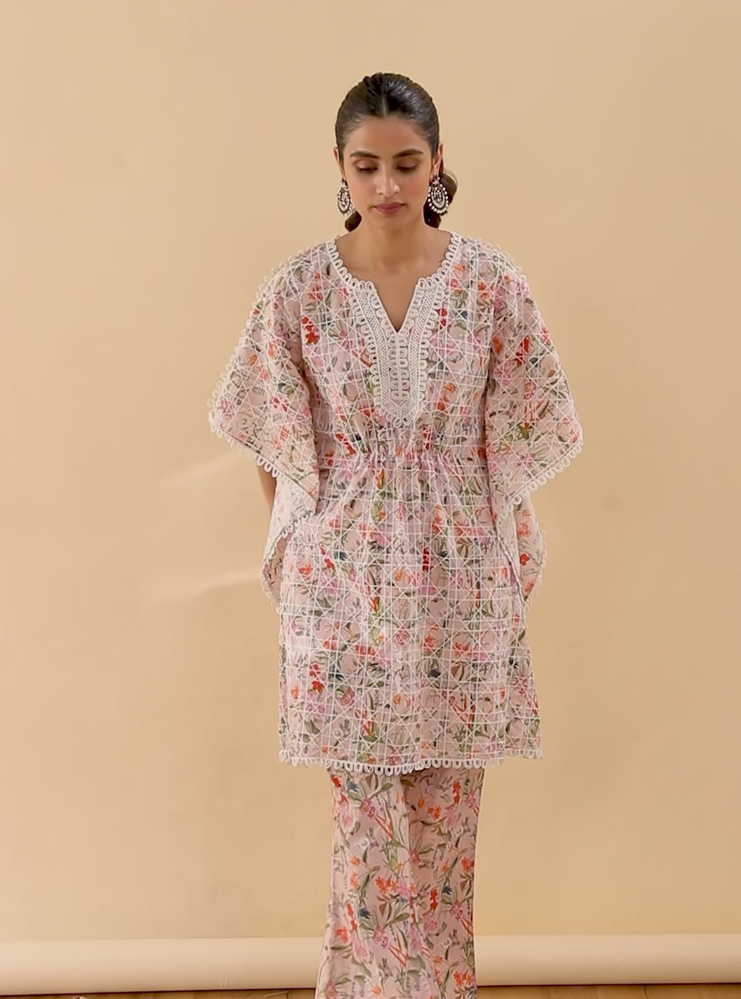 The keoni set in a light shade of pink is soothing for the summer, featuring a floral printed short kaftan kurta with diagonal embroidery, a flattering neckline finished with needlework and lace trims. The set comes with printed flared pants with matching lace trims.