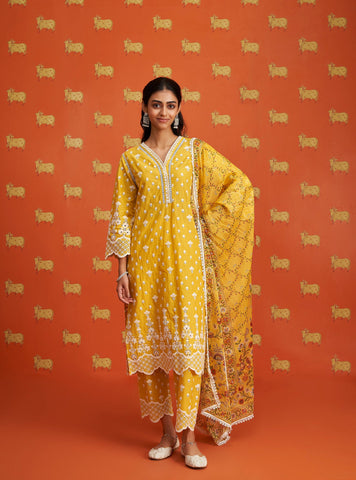 The straight kurta features a V-neckline and three-quarter sleeves, both accentuated by the detailed embroidery. The scalloped edges on the sleeves and hemline lend a feminine touch, making the outfit ideal for festive occasions or casual gatherings. The straight pants are adorned with subtle embroidery at the hem, echoing the design elements of the kurta.