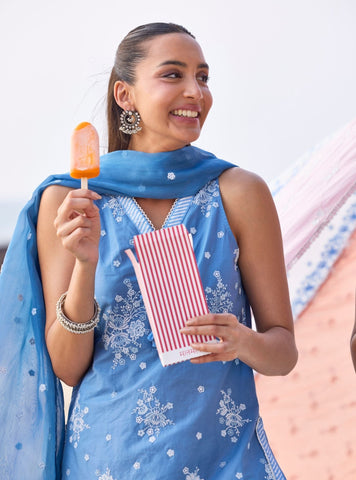 Fresh and feminine, the Liva kurta set is crafted in soft Supima cotton that feels light and breathable through the day. The kurta features delicate printed detailing and subtle accents that lend the silhouette a soft charm. It is paired with comfortable pink cotton salwar pants that create a playful colour contrast. The look is finished with a flowing organza dupatta featuring matching Liva prints. Perfect for daytime occasions, festive brunches and summer gatherings.