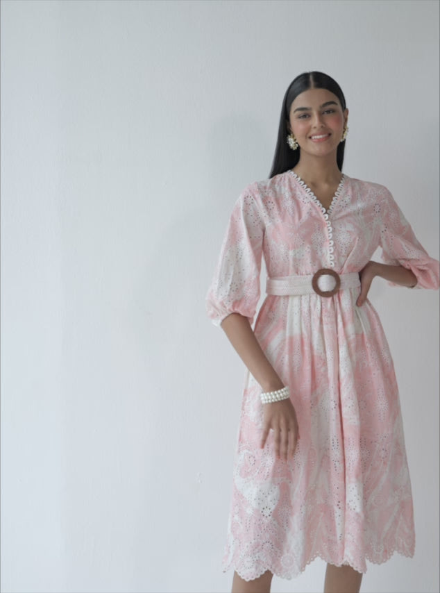 Our in-vogue Cotton Nero dress will be a game changer in your wardrobe. The soft pink shade, subtle cut-work on hem and sophisticated lace on neck line complete the charm of this dress. Not to forget the chic belt to give you that classy look.