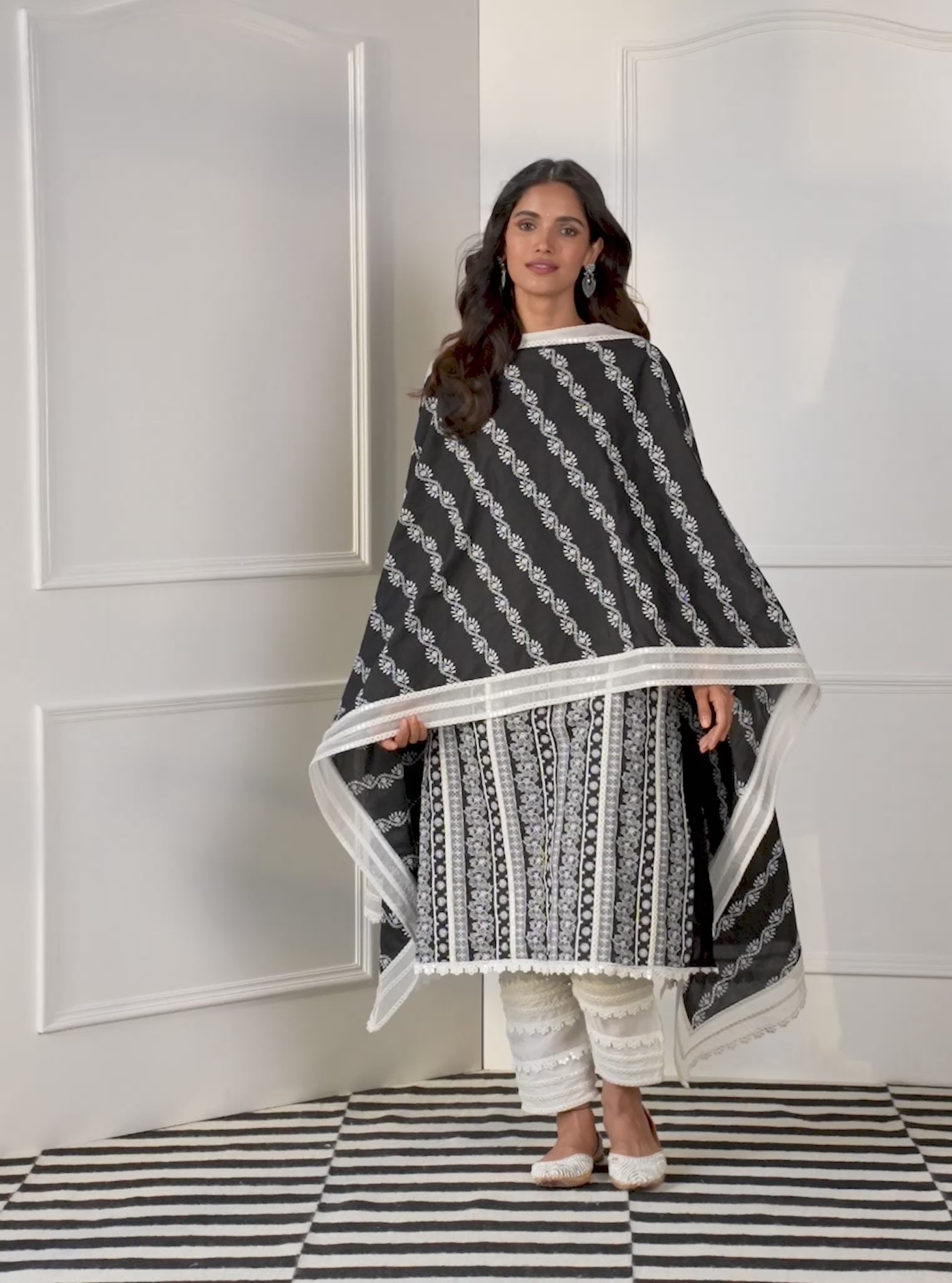 Mulmul Cotton Patricia Black Kurta with Mulmul Cotton Mirror Gota White Pant