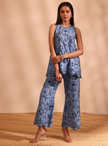 The sleeveless top features a clean round neckline and a flared silhouette, making it both flattering and breathable for warmer days. Paired with straight-cut pants, the set showcases intricate all-over embroidery, creating a breezy floral mosaic that feels like sunshine in motion.