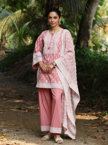 Embrace summer with this classic black and white kurta set, a perfect blend of comfort and tradition. The relaxed-fit short kurta, adorned with delicate black-threa ¶ÿembroidery, exudes an understated charm that is both timeless and versatile. Framed with intricate geometric borders and a tie-up neckline with tassels, this piece brings an artisanal touch to everyday dressing. Paired with broad palazzo pants, this set offers a breezy silhouette, making it an ideal choice for warm summer days. The coordinating dupatta, adorned with intricate patterns and a striking contrast border, adds a regal flair to the ensemble.¶ÿ