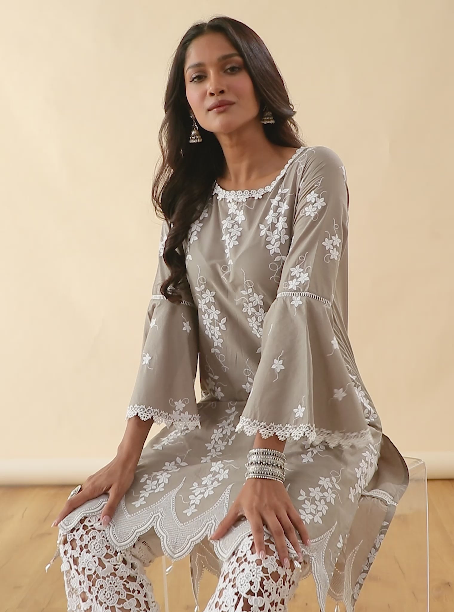 Mulmul Cotton Zuluk Grey Kurta With Tulip Lace White Pant
