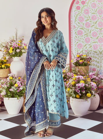 The straight-fit pants mirror the kurta’s embroidery at the hem, creating a seamless blend of design. Adding contrast and depth, the green dupatta features dense embroidered borders and paisley-inspired motifs scattered across its body. Perfect for pre-wedding festivities or intimate celebrations, this ensemble balances grace and grandeur with effortless ease.