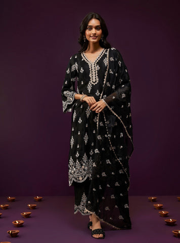 This sophisticated fuschia straight kurta and pants set is an elegant option for festive celebrations. Crafted from lightweight and delicate satin, this ensemble offers both comfort and style. Sequin gotta details embellish the V-neckline. The entirety of the kurta is adorned with delicate embroidery in contrasting white thread. The sleeves and hemline are scalloped, and adorned with delicate pearl hangings for a feminine touch. The straight pants complement the silhouette of the kurta perfectly and the ensemble is completed with a matching dupatta.
