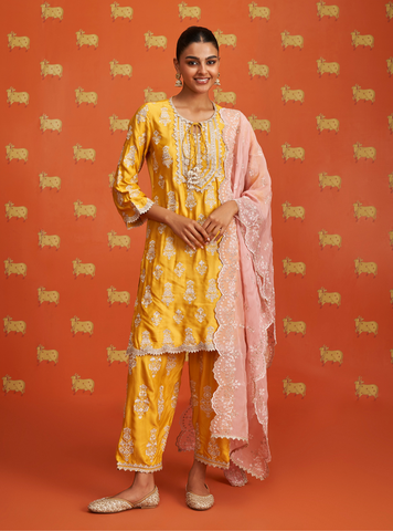 Step into the spotlight with this radiant yellow kurta set, a perfect blend of tradition and modern elegance. Crafted from luxurious Cupro silk, this outfit boasts a rich texture and a graceful sheen, making it an ideal choice for festive occasions or intimate gatherings. The kurta is adorned with intricate white floral embroidery, delicately scattered across the fabric. The soft V-neckline with a tie-up detail creates a flattering silhouette, while the tassels add a playful charm. The 3/4th sleeves are finished with gotta trim, perfectly complementing the gotta detailing at the hemline, offering a refined finish to the overall look.