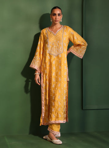 Paired with straight-cut pants in matching hues, this ensemble ensures both comfort and style. Completing the set is a coordinated dupatta with ornate borders, featuring a blend of zari work and traditional embroidery, adding the perfect finishing touch.
