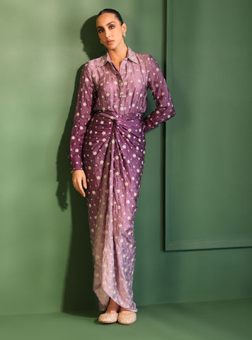 The full-sleeved shirt-style blouse, with its structured collar and button-down detail, adds a contemporary edge to the ensemble. The highlight of this look is the pre-draped skirt, artfully gathered at the waist to create a sculptural silhouette. The gentle ruching enhances movement, while the cascading drape elongates the form, making it a vision of grace and poise.