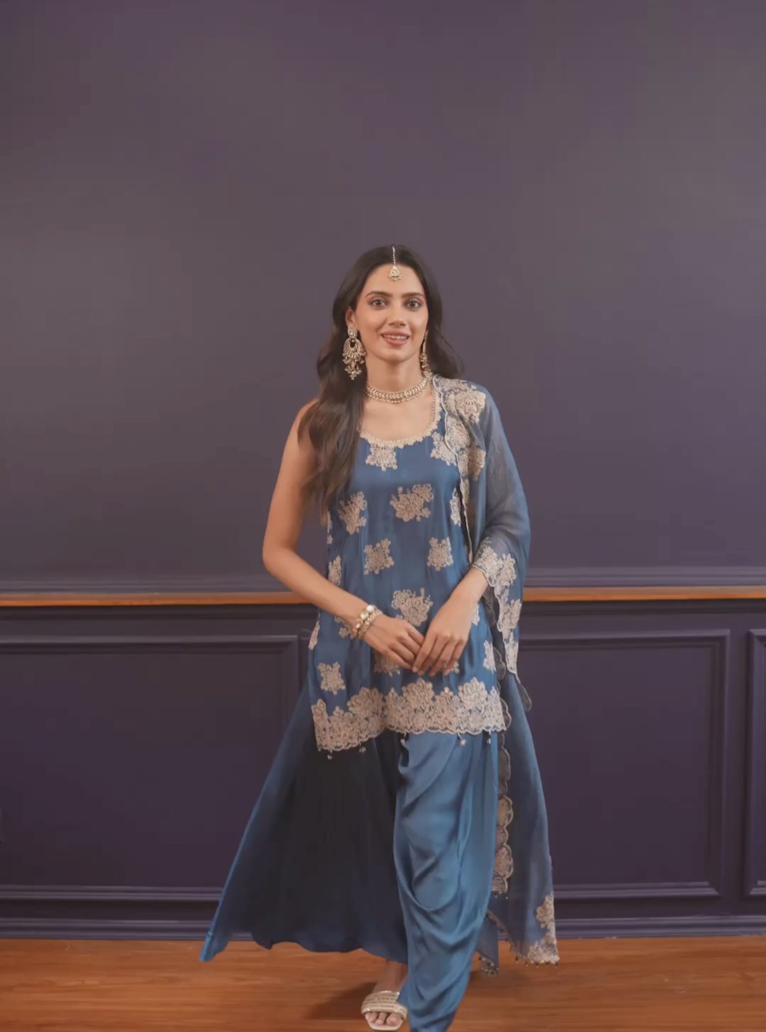 An elegant take on festive dressing — the Pahi Kurta Set in Navy redefines sophistication. The lustrous Cupro Satin Kurta features intricate threadwork and an asymmetric silhouette that flatters every frame. Paired with fluid Tissue Draped Pants and a glimmering Lurex-Insert Dupatta, this set is made for intimate celebrations and evening soirées where comfort meets quiet glamour.