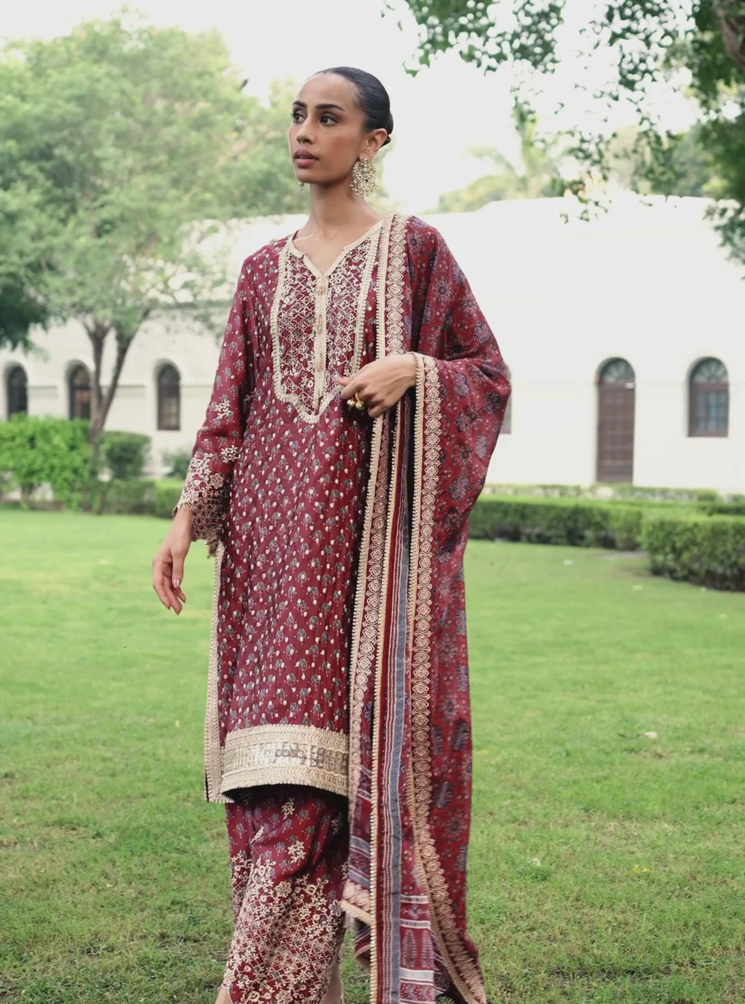 A red Ajrakh-printed kurta set finished in smooth cupro satin. The kurta features ornate yoke detailing and contrast borders, paired with printed pants and a lightweight organza dupatta for an effortlessly dressy ensemble with traditional charm.