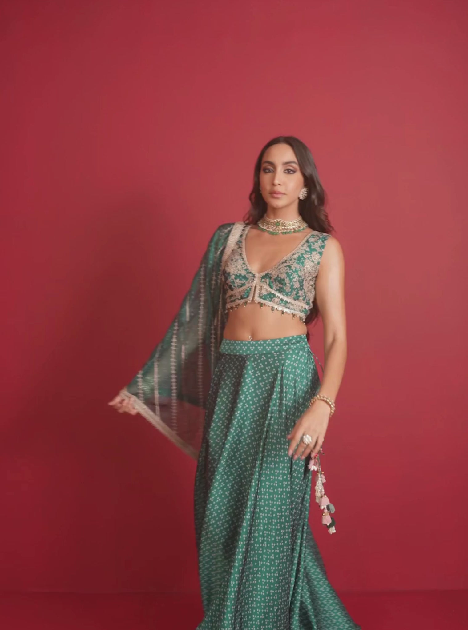 A festive standout in emerald green, this printed cupro satin blouse and skirt set is paired with a soft organza dupatta. The structured blouse and flowing skirt create a balanced silhouette, while the dupatta adds a delicate layer of grace.