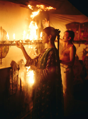 Playful and celebratory, this fuschia cupro satin kurta is cut in a flattering A-line silhouette. Dhoti pants bring ease and movement, while the pista green organza dupatta adds a soft, complementary finish. A perfect blend of bold and balanced.