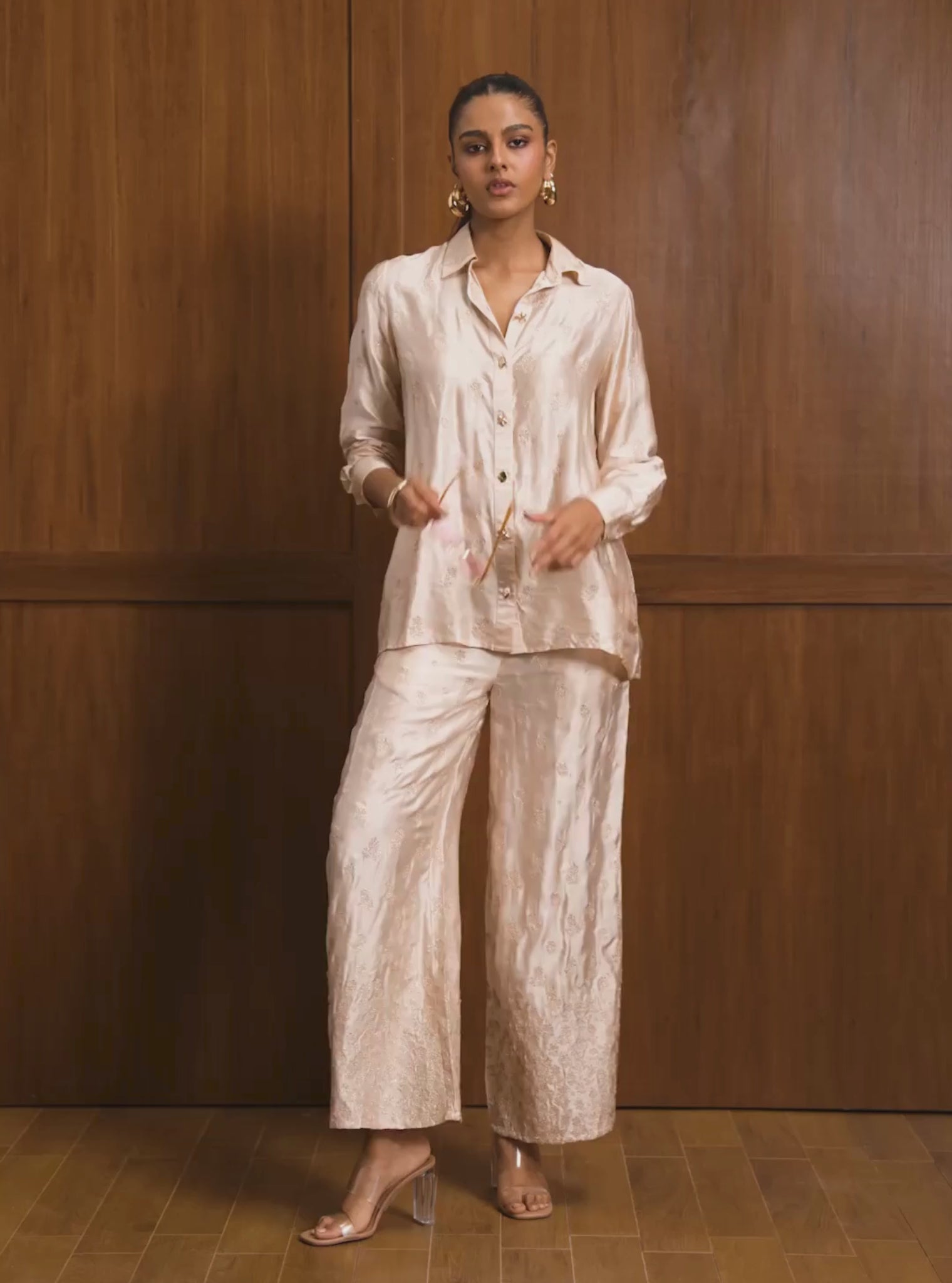 A relaxed shirt-and-pant set crafted in smooth cupro satin with a soft, fluid finish. The Santree silhouette is designed for ease, offering a clean structure that drapes comfortably on the body. The champagne tone keeps it understated yet occasion-appropriate, making it suitable for wedding events, festive evenings, and elevated day functions.