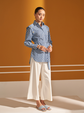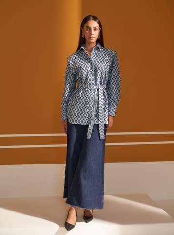 This chic blue shirt is the epitome of smart-casual elegance, perfect for transitioning seamlessly between workwear and relaxed outings. Crafted from lightweight, breathable denim, the shirt features intricate geometric embroidery in dark blue, creating a visually striking yet sophisticated look. The classic shirt collar, full-length sleeves, and front button placket lend a structured appeal, while the tailored fit enhances your silhouette. A standout feature is the self-tie belt, designed to cinch the waist and add a contemporary touch to the otherwise traditional design.