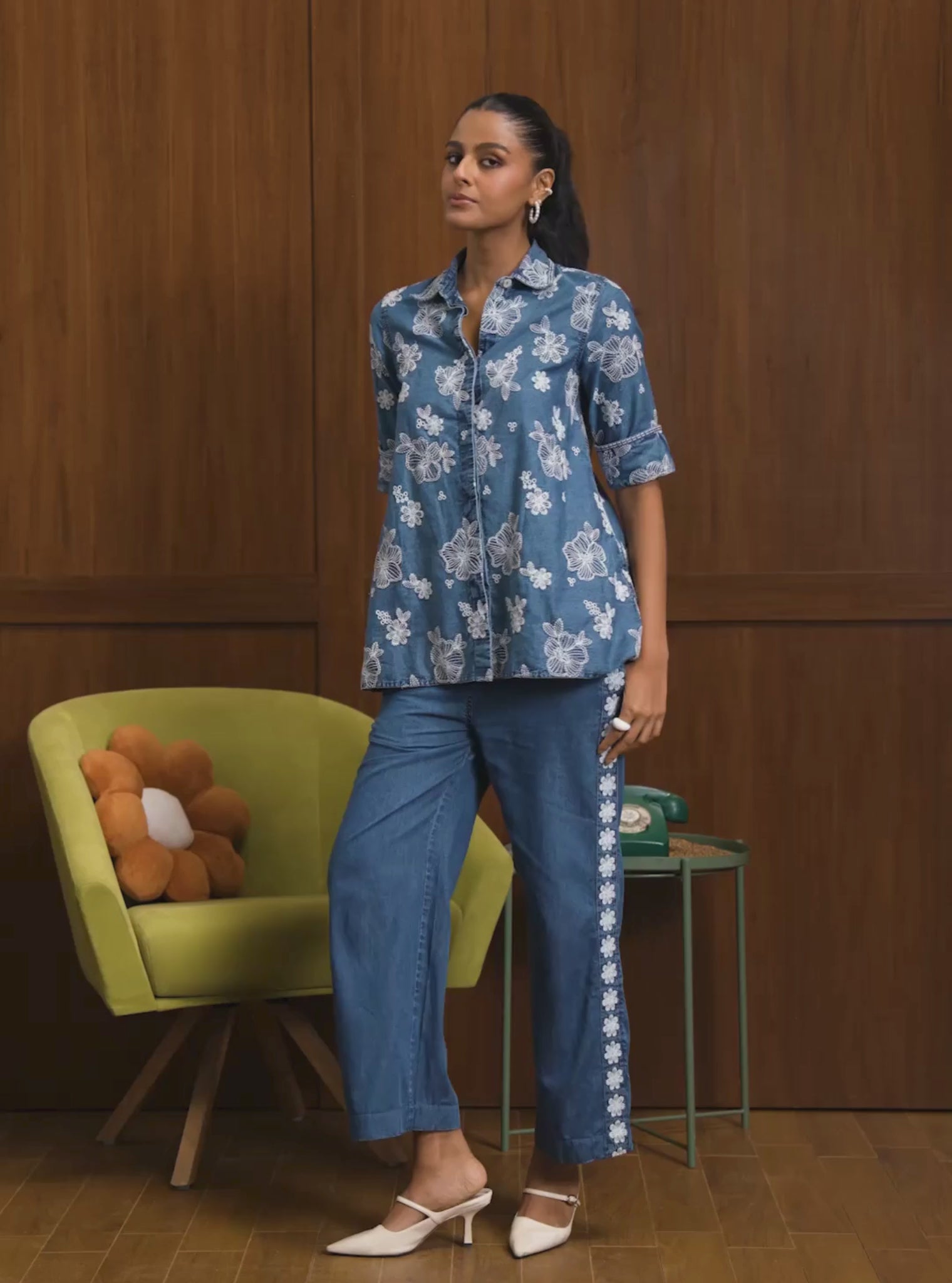 A relaxed denim co-ord set built for easy, everyday dressing. The Tavi Shirt Set blends a soft handfeel with a straight, fuss-free silhouette and subtle tonal print. Paired with matching straight-cut pants, this set lives in that sweet spot between polished and effortless. Wear it for airport runs, coffee plans, or casual Fridays - this is denim, reimagined for comfort.