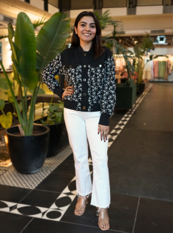 Elevate your casual wardrobe with this trendy and unique bomber jacket that beautifully combines denim and beige hues with delicate floral embroidery. This statement piece features a dual-tone design. The jacket is tailored with a classic bomber silhouette, complete with ribbed cuffs, hem, and collar for a sporty yet refined look.