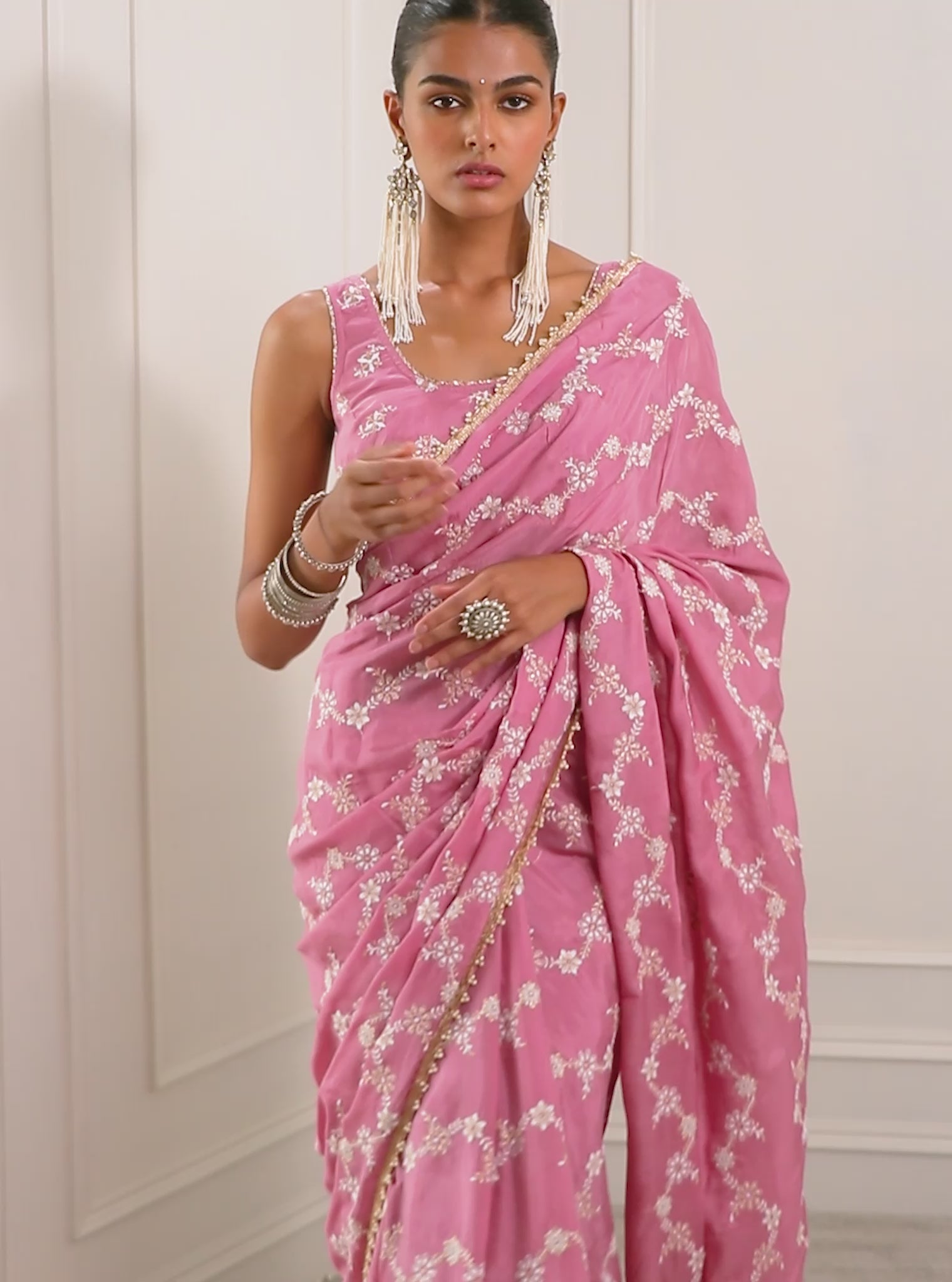 The Pelling Saree Is Perfect For The Season?Ÿ With Diagonally Embroidered Florals And?Ÿ A?Ÿ Graceful Flow Owing To The High Quality Silk?Ÿ Fabric.?Ÿ The Mauve ?Ÿsaree Is Complimented With A?Ÿ Gota Border, Adding A Subtle Festive Touch.
