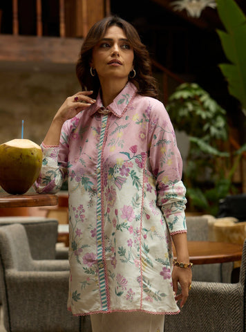 Crafted in lightweight fabric with a gentle sheen, the shirt-style kurta features a fresh floral print with contrasting trims and button-down detailing, blending structure with elegance.