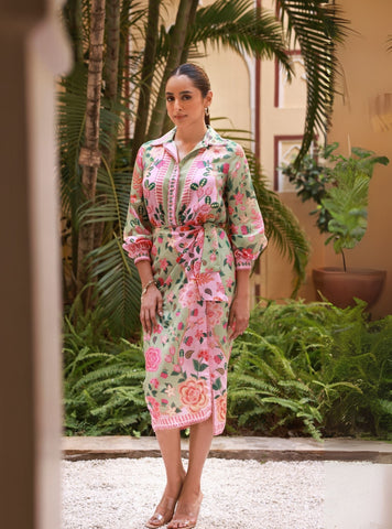 A statement co-ord in breathable lawn fabric, the Raisa set pairs soft structure with bold print. The shirt features a collared neckline, three-quarter sleeves, and all-over floral prints in shades of pink against a fresh green base. Subtle stripe detailing adds definition along the placket and cuffs.
