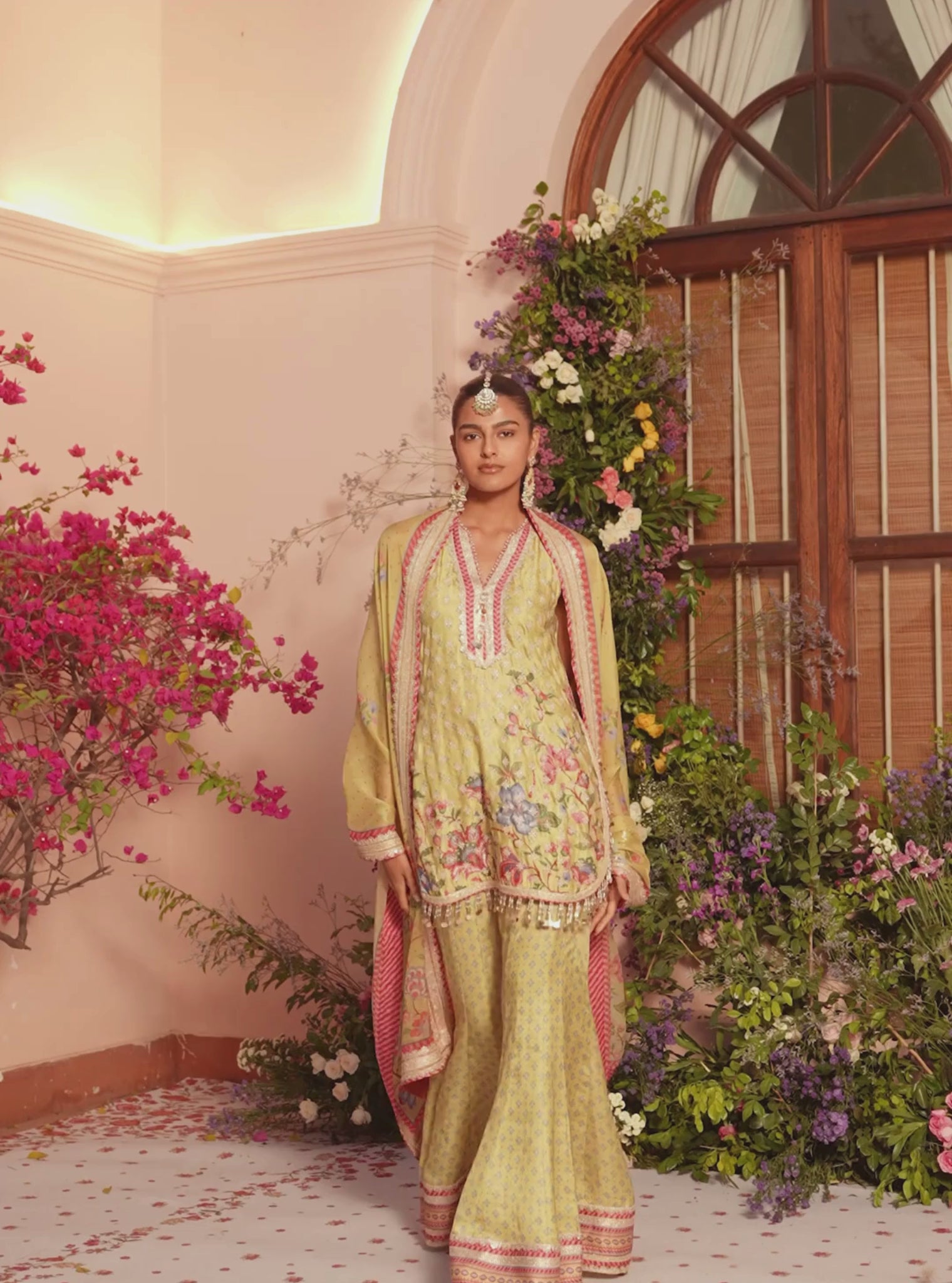 Crafted in breathable linen satin, this printed kurta set pairs a fluid kurta with matching linen satin sharara. Light, easy, and thoughtfully detailed, it’s designed for daytime celebrations, festive gatherings, and warm-weather wedding moments.